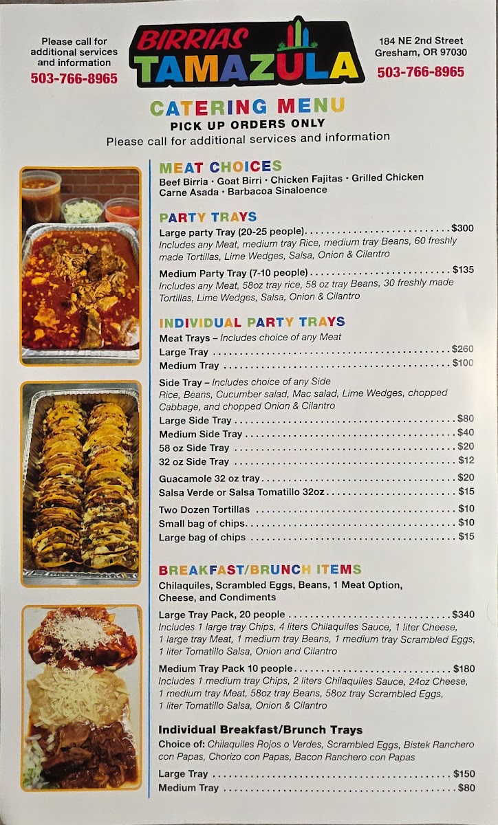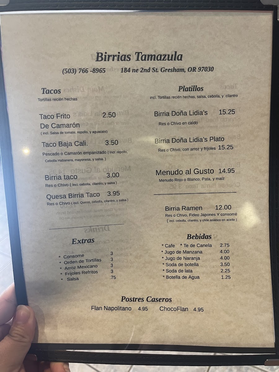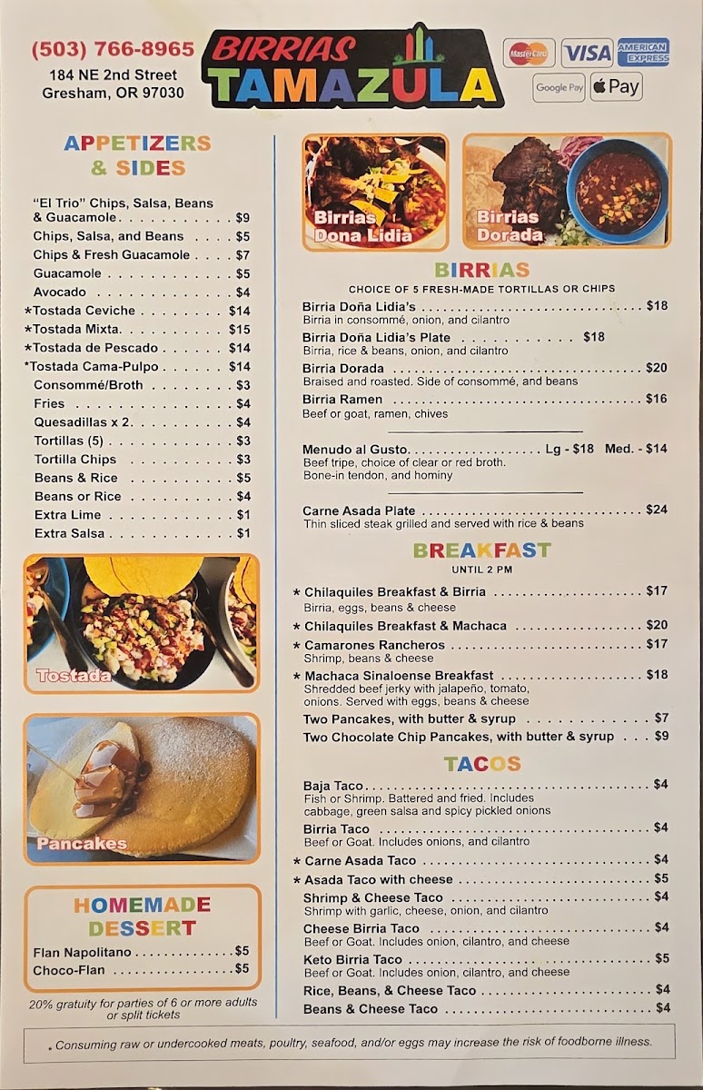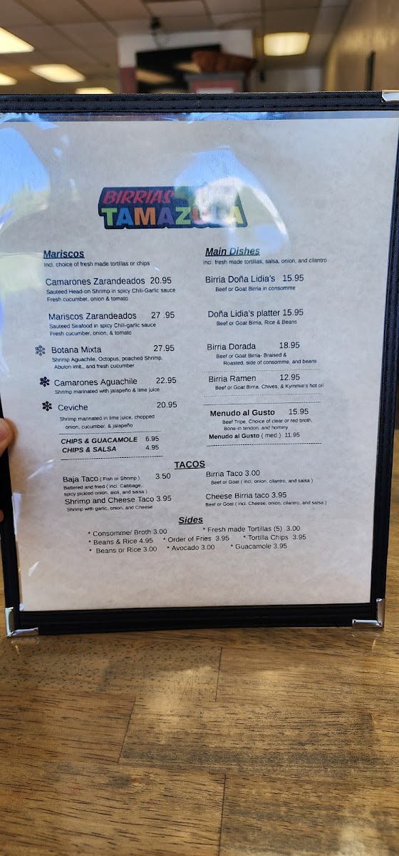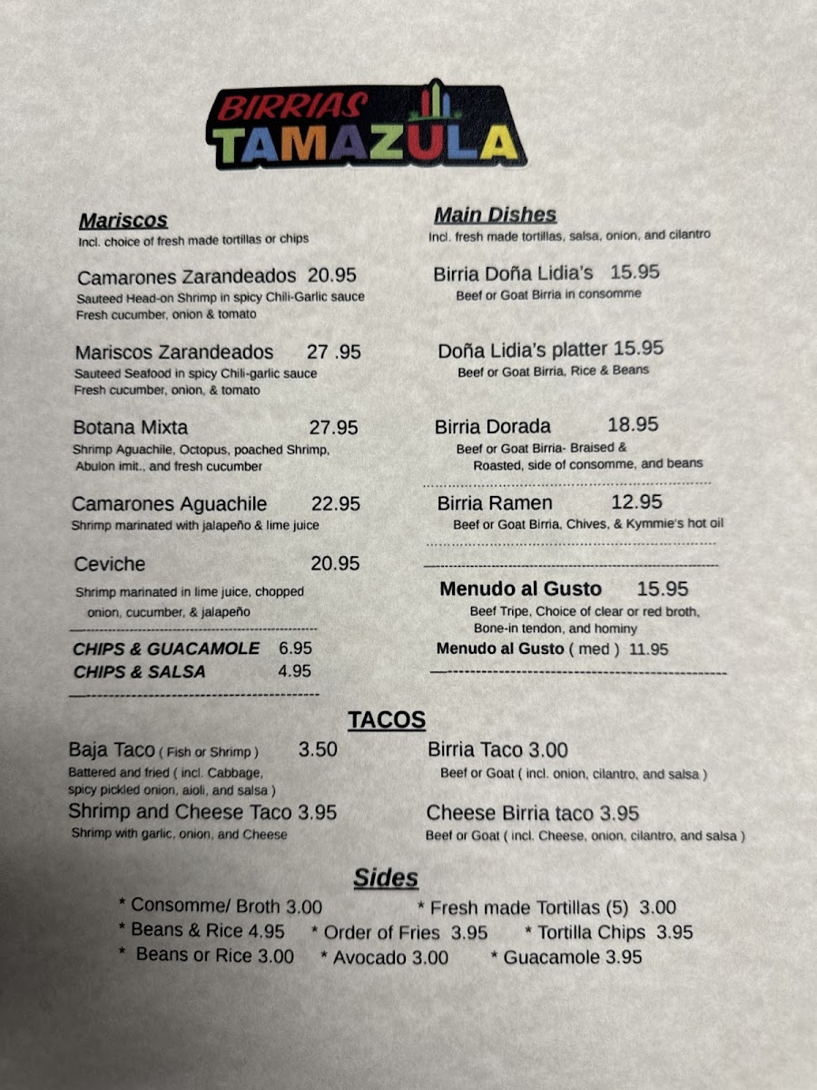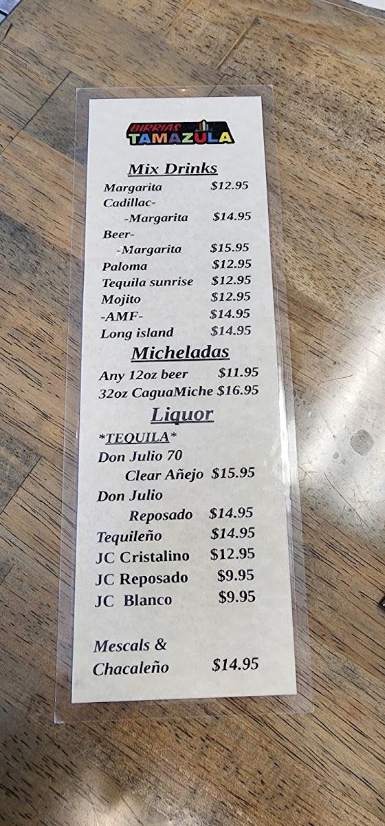 The menu at Birrias Tamazula offers a delicious variety of traditional Mexican dishes that will satisfy any craving for bold, flavorful food. Among the standout options, the Caguachelada stands out as a refreshing, flavorful choice, perfect for pairing with one of their hearty tacos. Speaking of tacos, the Fried Shrimp Taco is a crowd favorite, featuring perfectly crispy shrimp with a burst of flavor. If you're looking for a comforting and simple option, the Cheese Taco is an ideal choice, showcasing a delicious balance of creamy cheese in a soft tortilla. For a more filling meal, the Taco Plate is an excellent option, offering a generous serving of tacos with sides that complete the dish. Another highlight is the Aguachile, a zesty and spicy shrimp dish that provides an exciting contrast of fresh flavors. Each dish on the menu offers something unique, making it clear why Birrias Tamazula is a beloved spot for those craving authentic Mexican cuisine.